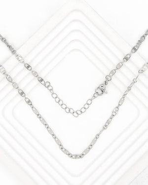 Cadena de placa tallada, tiene baño de rodio e incluye 1 unidad.
