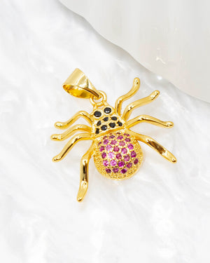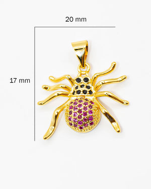 Dije de araña con circones negros y fucsia, tiene baño de rodio, incluye 1 unidad.