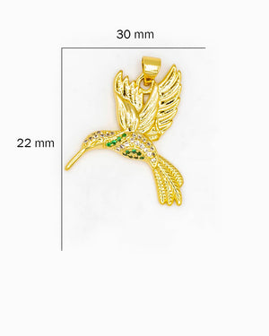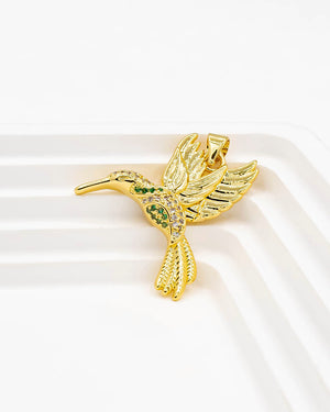 Dije colibrí con circones verdes y blancos, tiene baño de rodio e incluye 1 unidad.
