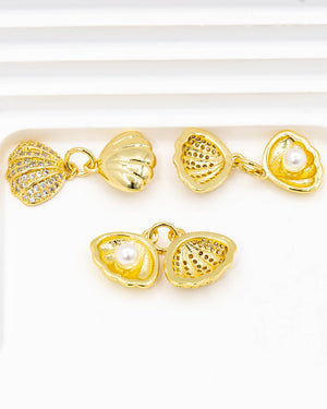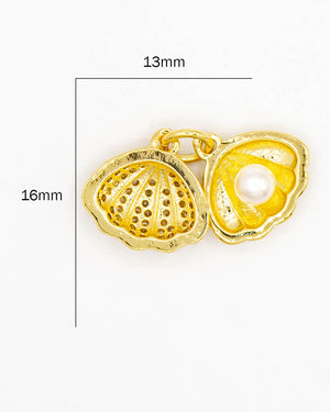 Dije concha de mar doble con perla en medio y circones de un lado, tiene baño de rodio e incluye 1 unidad