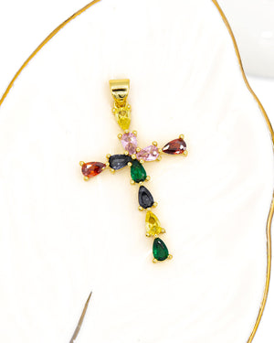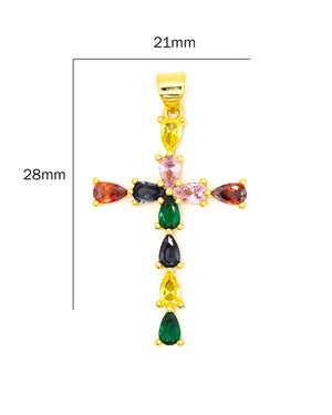Dije de cruz con circones de colores, tiene baño de rodio e incluye 1 unidad.