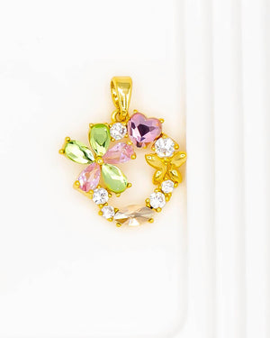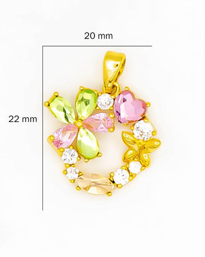 Dije de flor, mariposa y corazón con circones de colores, tiene baño de rodio e incluye 1 unidad.