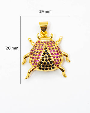 Dije de mariquita con circones negros y fucsia, tiene baño de rodio, incluye 1 unidad.