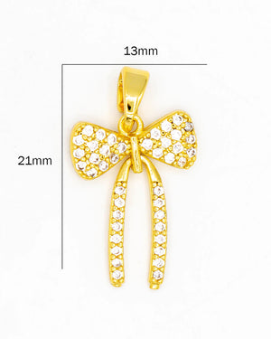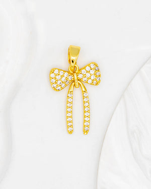 Dije de moño con circones y listones articulados, tiene baño de rodio e incluye 1 unidad.