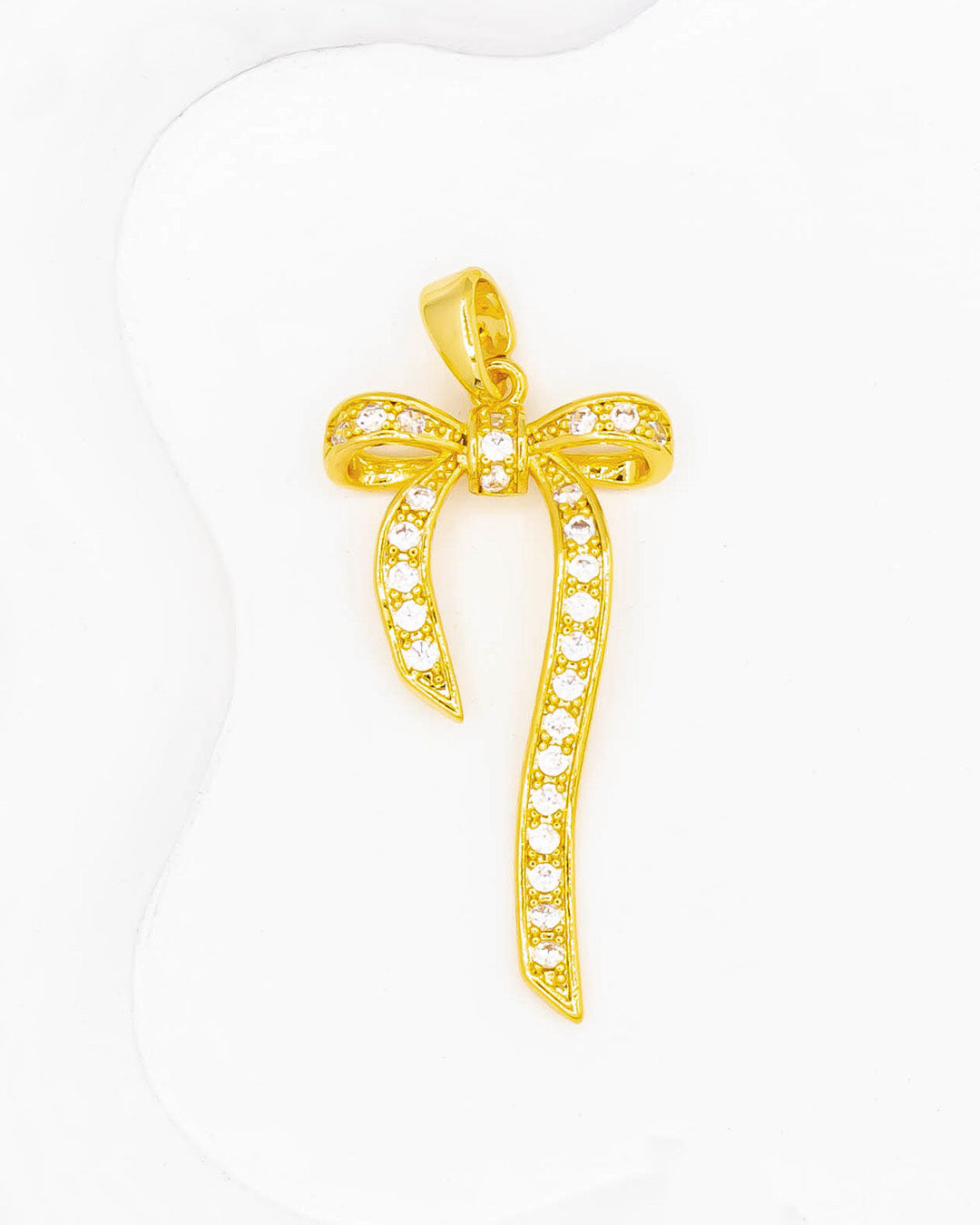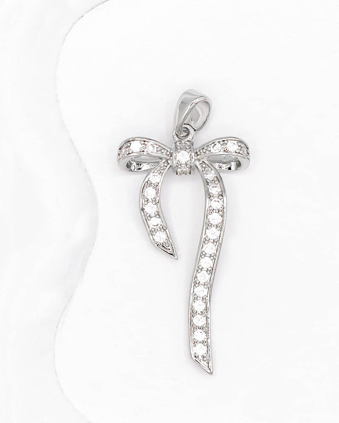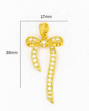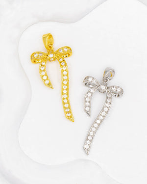 Dije de moño con circones, tiene baño de rodio e incluye 1 unidad.