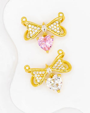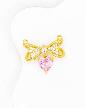 Dije de moño con un circón en forma de corazón colgando, tiene baño de rodio e incluye 1 unidad