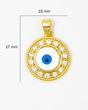 Dije ojo turco redondo, tiene baño de rodio, incluye 1 unidad.
