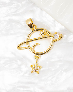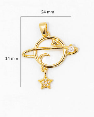 Dije planeta, luna y estrella pequeña con circones, tiene baño de rodio, incluye 1 unidad.
