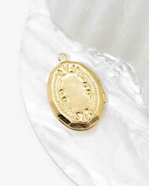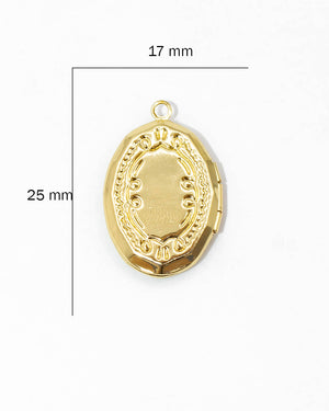 Dije relicario ovalado con diseño, tiene baño de rodio, incluye 1 unidad.