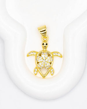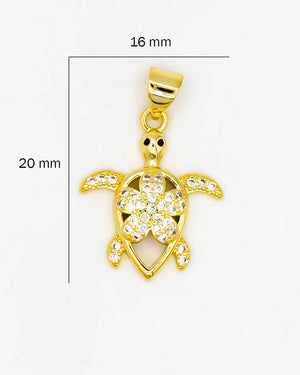 Dije de tortuga de mar con circones y una flor en medio, tiene baño de rodio e incluye 1 unidad