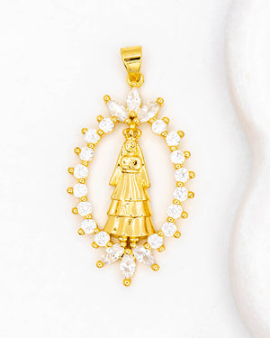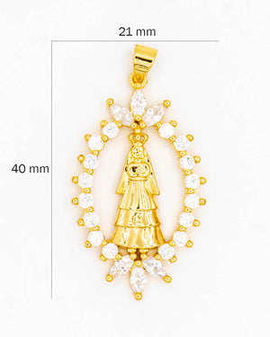 Dije religioso de virgen con circones, tiene baño de rodio e incluye 1 unidad