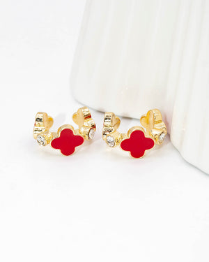 Earcuff trébol rojo con circón blanco, tiene baño de rodio, incluye 1 unidad.