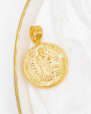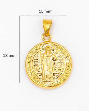 Oro laminado dije San Benito, tiene baño de rodio, incluye 1 unidad.