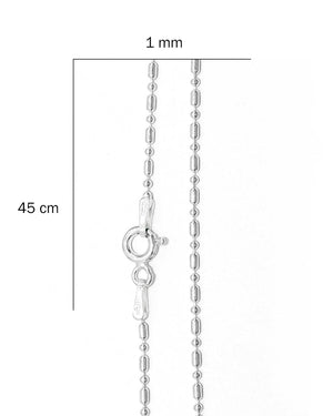Cadena palito bolita en plata ley 925, medida de 45 cm de largo y 1 mm de grosor.