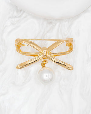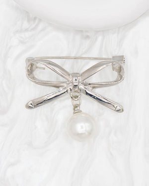 Prendedor de moño con perla colgando, tiene baño de rodio e incluye 1 unidad.