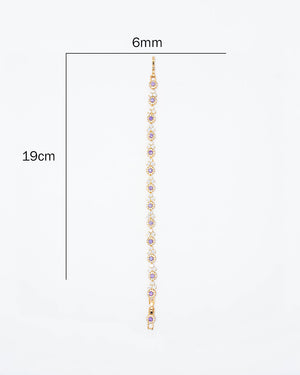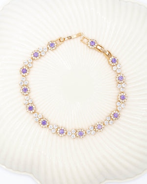 Pulsera de circones blancos y lilas, tiene baño de rodio e incluye 1 unidad.