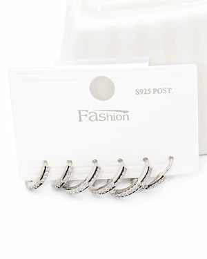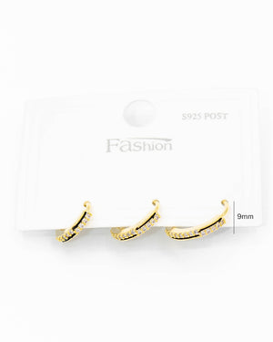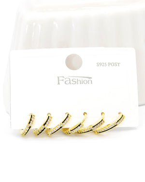 Set de candongas triple con circones blancos contrastado con esmalte negro, tiene baño de rodio e incluye 3 pares.