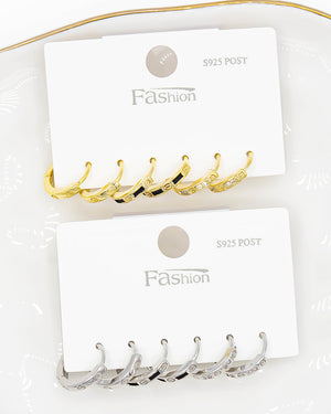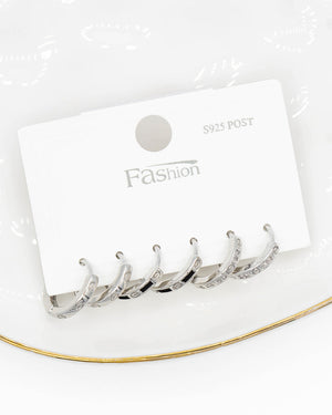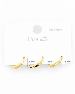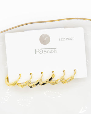 Set de candongas triple con circones blancos contrastado con esmalte negro y detalles en relieve, tiene baño de rodio e incluye 3 pares.