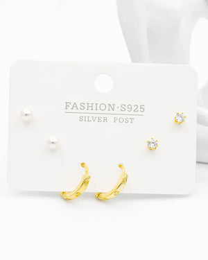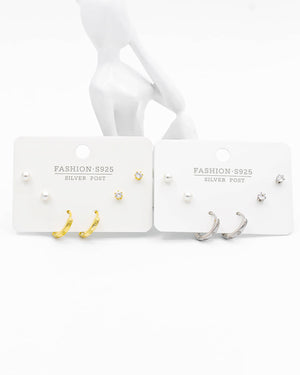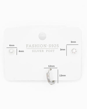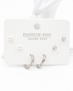 Set de candongas con detalles en relieve con topos de circón y perla, tiene baño de rodio e incluye 3 pares.