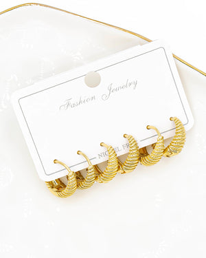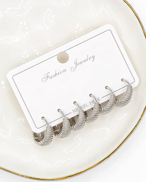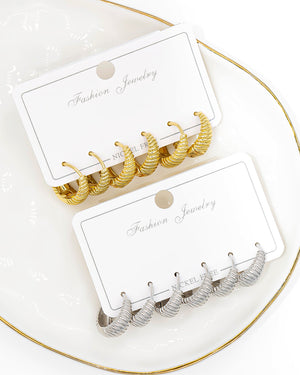 Set triple candongas con textura, tiene baño de rodio e incluye 3 pares.