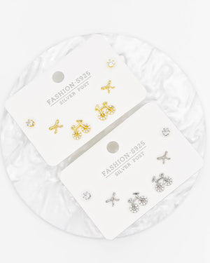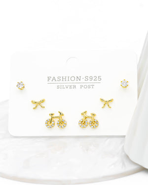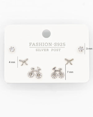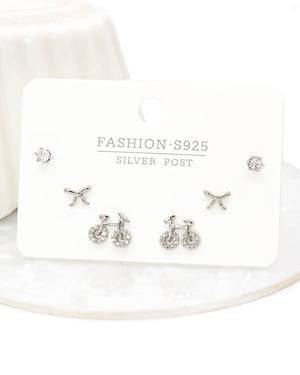 Set de topos triple bicicleta, moño y circón, tiene baño de rodio e incluye 3 pares.