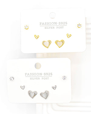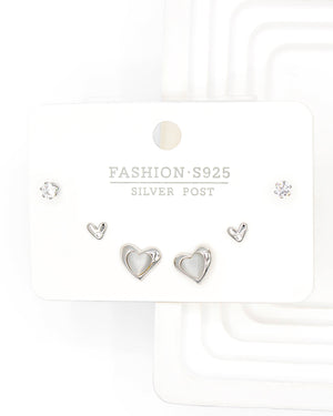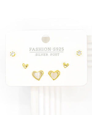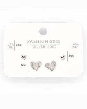 Set de topos triple corazón con circón, tiene baño de rodio e incluye 3 pares.