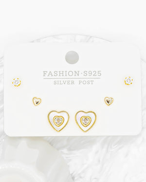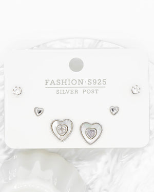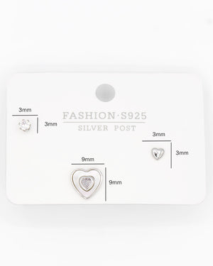Set de topos triple corazón, tiene baño de rodio e incluye 3 pares.
