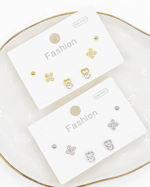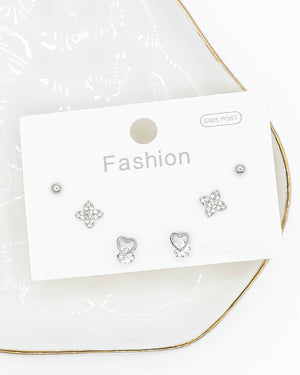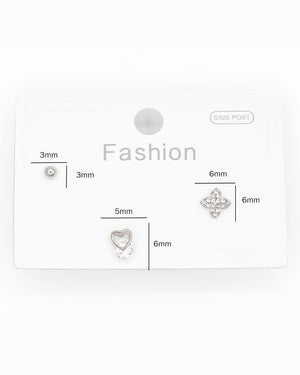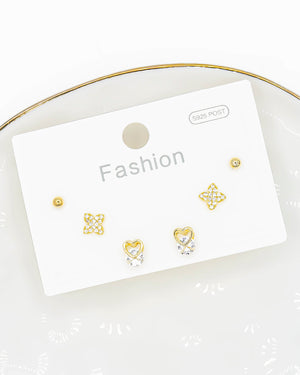 Set de topos triple corazón, trébol y circón, tiene baño de rodio e incluye 3 pares.