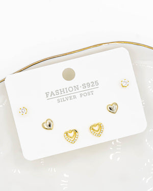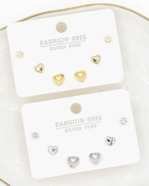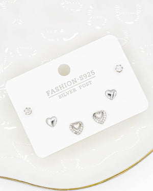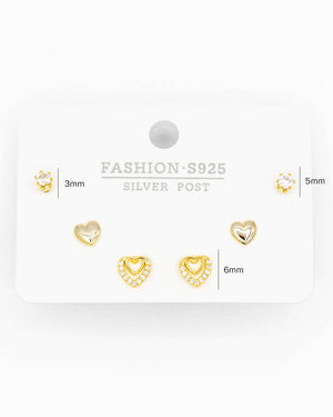 Set de topos triple corazón con circón, tiene baño de rodio e incluye 3 pares.