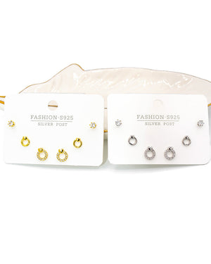 Set de topos triple con corazones y circón, tiene baño de rodio e incluye 3 pares.