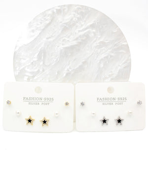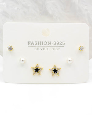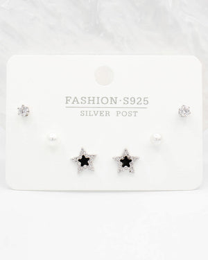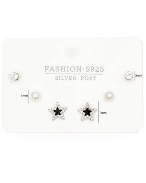 Set de topos triple con estrella, perla y circón, tiene baño de rodio e incluye 3 pares.