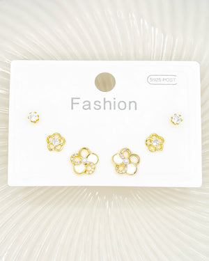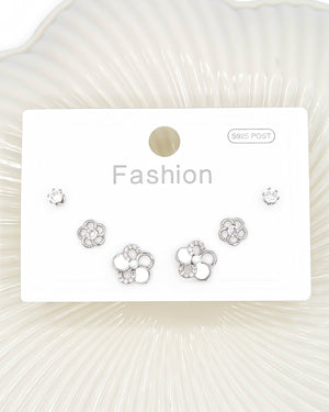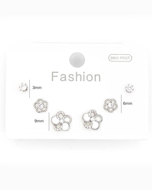 Set de topos triple flor y circón, tiene baño de rodio e incluye 3 pares.