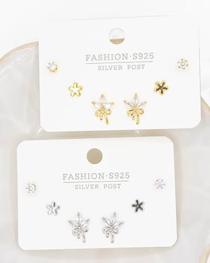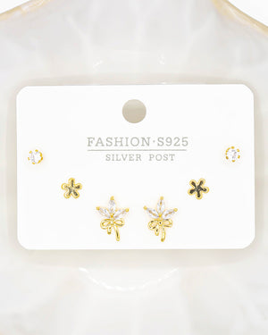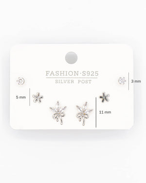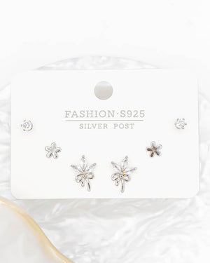 Set de topos triple con flores y circón, tiene baño de rodio e incluye 3 pares.