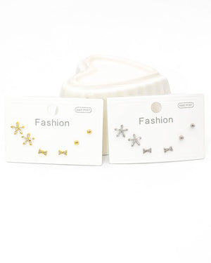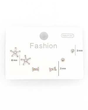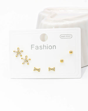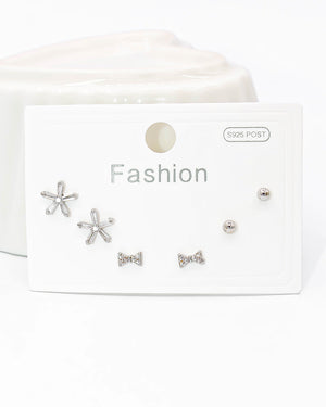 Set de topos triple con flor, moño y balín, tiene baño de rodio e incluye 3 pares.