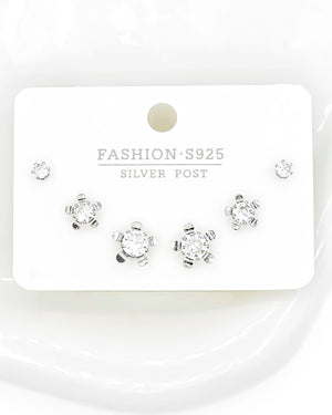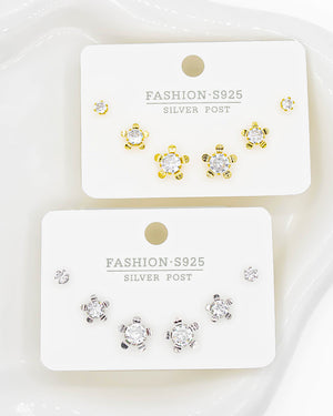 Set triple topo flor, tiene baño de rodio e incluye 3 pares.