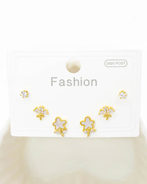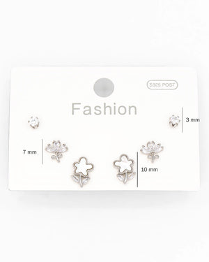 Set de topos triple con flor y circón, tiene baño de rodio e incluye 3 pares.