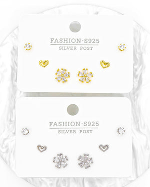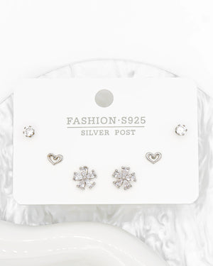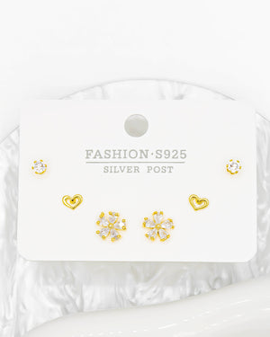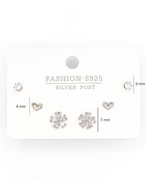 Set de topos triple con flor, corazón y circón, tiene baño de rodio e incluye 3 pares.