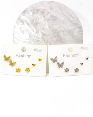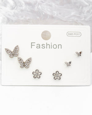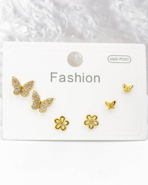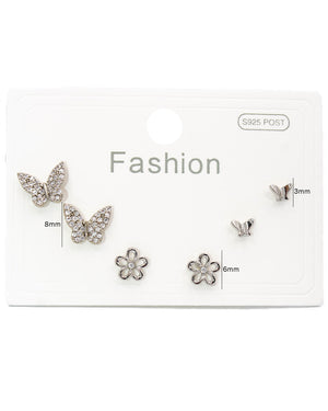 Set topos triple con mariposas y flor, tiene baño de rodio e incluye 3 pares.