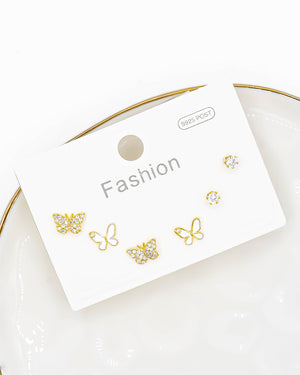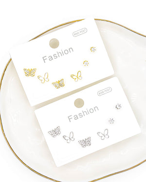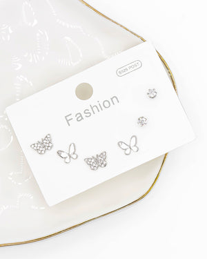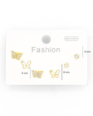 Set de topos triple mariposa y circón, tiene baño de rodio e incluye 3 pares.