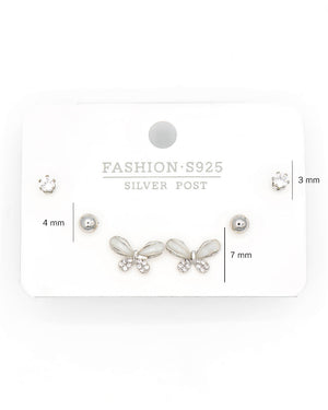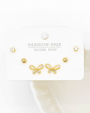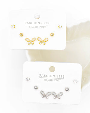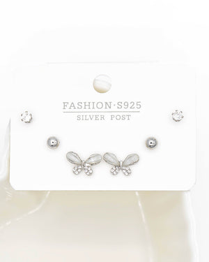 Set triple topo mariposa con balines y circones, tiene baño de rodio e incluye 3 pares.