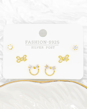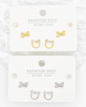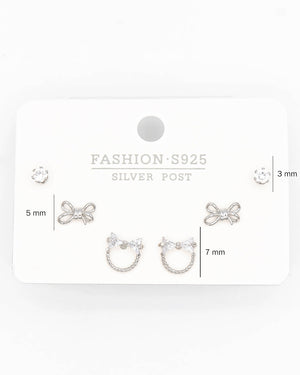 Set de topos triple moño con circón, tiene baño de rodio e incluye 3 pares.