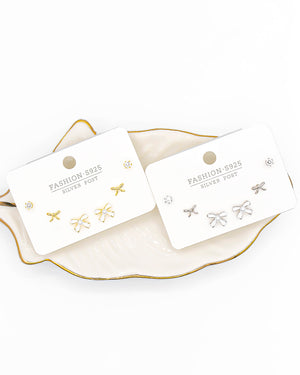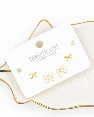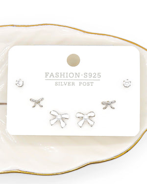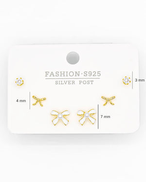 Set de topos triple moño con circón, tiene baño de rodio e incluye 3 pares.