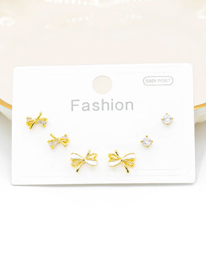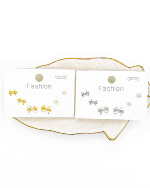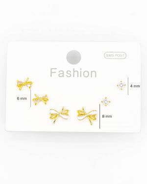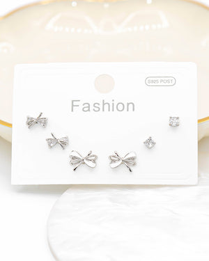 Set de topos triple moño y circón, tiene baño de rodio e incluye 3 pares.