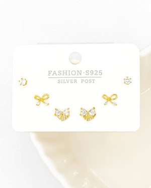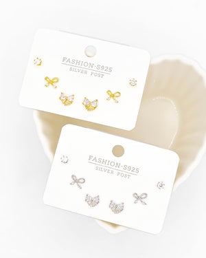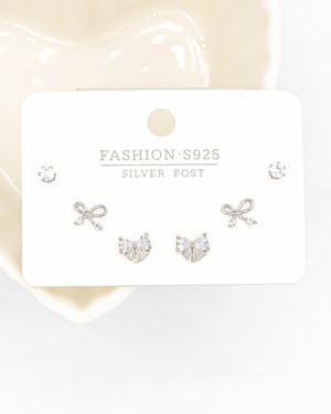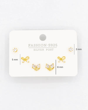 Set triple topo moño y circones, tiene baño de rodio e incluye 3 pares.
