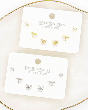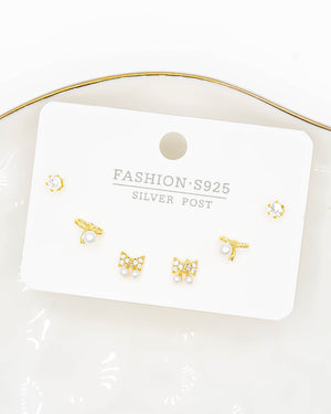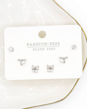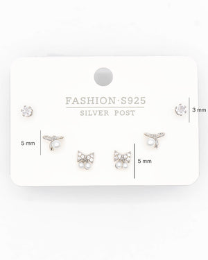 Set de topos triple moño mini con perla, tiene baño de rodio e incluye 3 pares.