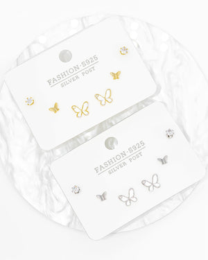 Set de topos triple mariposa y circón, tiene baño de rodio e incluye 3 pares.