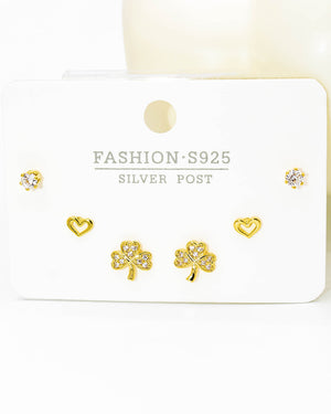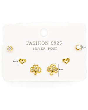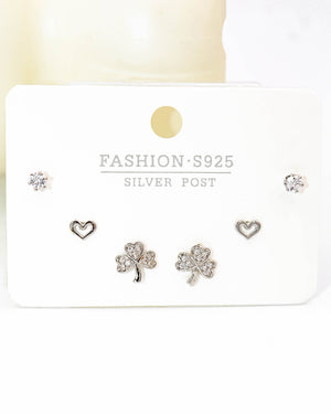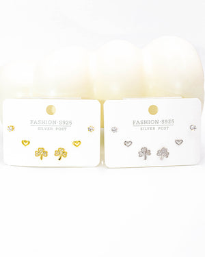 Set de topos triple con trébol, corazón y circón tiene baño de rodio e incluye 3 pares.