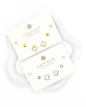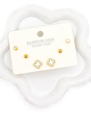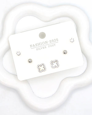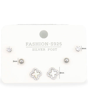 Set topos triple trébol, circón y balín, tiene baño de rodio e incluye 3 pares.