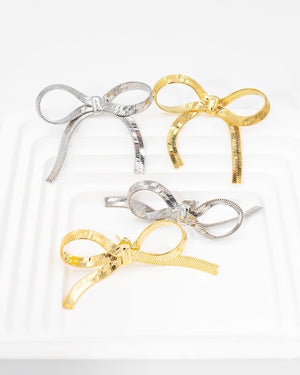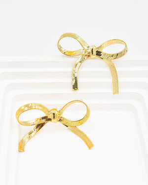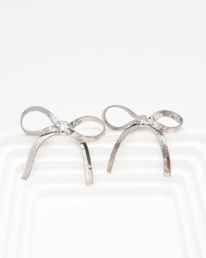 Topo de moño con listones cortos en tejido de serpiente, tiene baño de rodio e incluye 1 par.