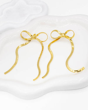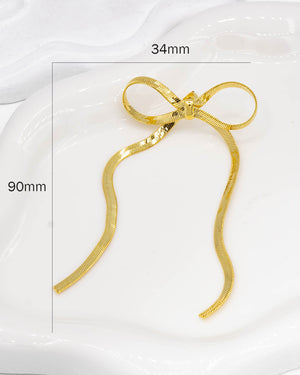 Topo de moño con listones largos en tejido de serpiente , tiene baño de rodio e incluye 1 par con topo mariposa